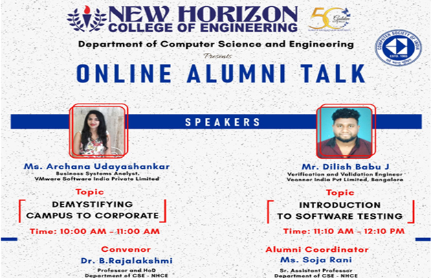 Department of CSE in association with CSI Student chapter organized Online ALUMNI TALK” on 26th September 2020 from 10AM to 12PM. The event comprised of 2 sessions – one for 3rd semester students and another one for 5th semester students. The invited alumni speakers for the event are: