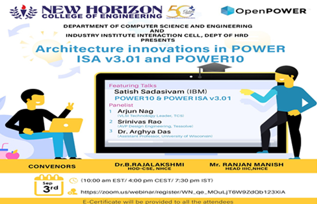 Department of Computer Science and Engineering in association with Industry Institute Interaction Cell of NHCE and IBM OpenPOWER,Center of Excellence organized webinar on “Architecture innovations in POWER ISA v3.01 and POWER10” on 03 Sep 2020 .
