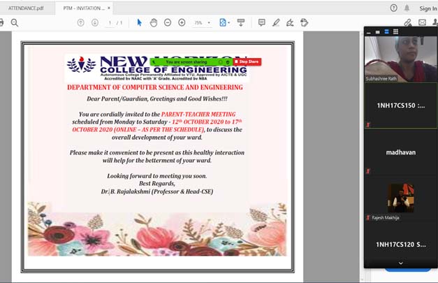 The department of CSE organized “Online Parent-Teacher Meet” due to COVID situation, that served as a connection platform for parents, teachers and the students, where teacher and parents come together to enrich the student’s educational experiences and discussed variety of issues, regarding all round development of students.