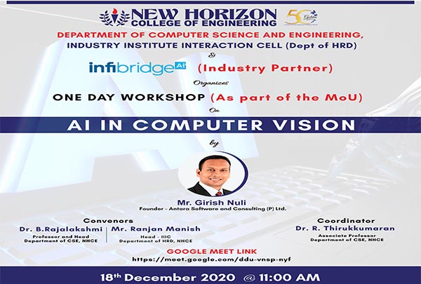 Department of Computer Science and Engineering and Industry Institute Interaction Cell of NHCE in association with Infibridge has organized One Day Workshop on “AI in Computer Vision” on 18th December 2020.