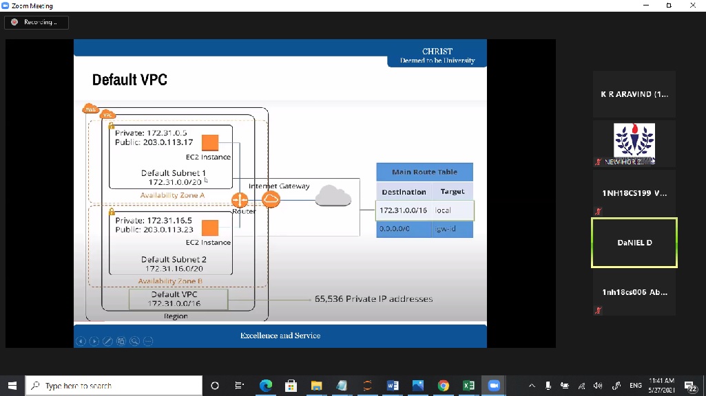 Daniel D, Assistant Professor form Christ University presented a technical talk on “EXPLORING REAL TIME AWS CLOUD FEATURES”. He gave an insight of creating a VPN and the steps to be followed by using Amazon web Service. Around 160 students of 6th semester students participated this event. This event is conducted through online mode considering this pandemic situation.