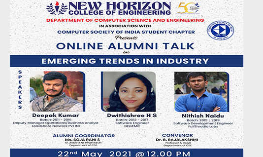 Department of CSE in association with CSI Student chapter organized Online ALUMNI TALK on 22nd May 2021 from 12PM to 1PM. There were 3 speakers for the event.