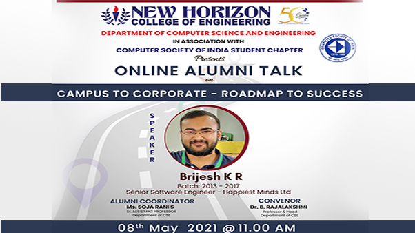 Department of CSE in association with CSI Student chapter organized Online ALUMNI TALK on 8th May 2021 from 11AM to 12PM.