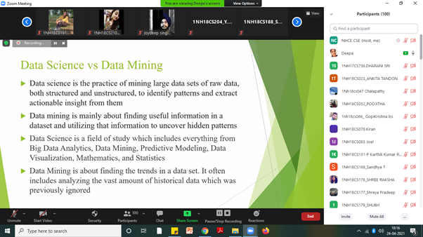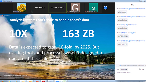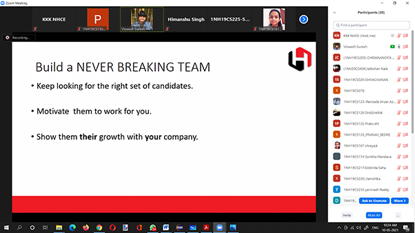 The event was started by welcoming Speaker, HOD, and Participants and with a brief introduction of the Speaker, Mr. Viswesh Suresh, Founder, Humanoid Systems; The event was organized to address 4th-semester students of CSE, were total of 35 students were participated in the live webinar.