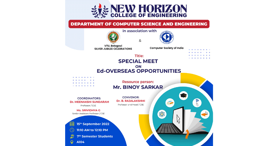 The Department of CSE organized an Expert Lecture on “Ed- Overseas Opportunities”, for 7th Sem CSE students on 15/09/2022 from 11.10 AM to 12.10 PM.
