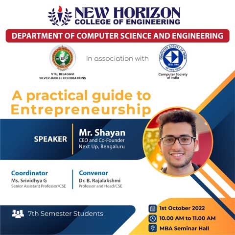 The Department of CSE organized Entrepreneurship Awareness Program for 7th Semester students on 01/10/2022 from 10.00 AM to 11.00 AM. Our Resource person is Mr. Menahi Shayan, CEO and Co-Founder, NEXT UP.