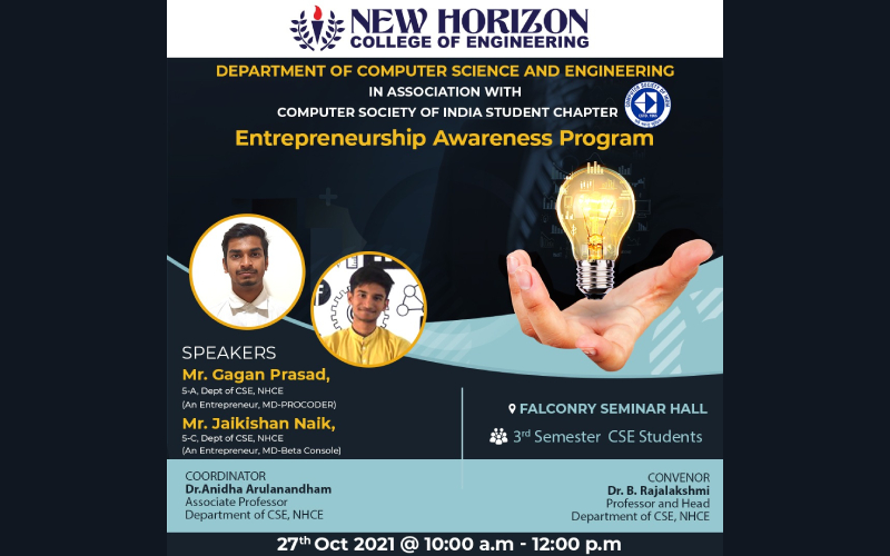 The Department of CSE organized Entrepreneurship Awareness Program for 3rd semester students on 27/10/2021 from 10.00 AM to 12.00 PM.