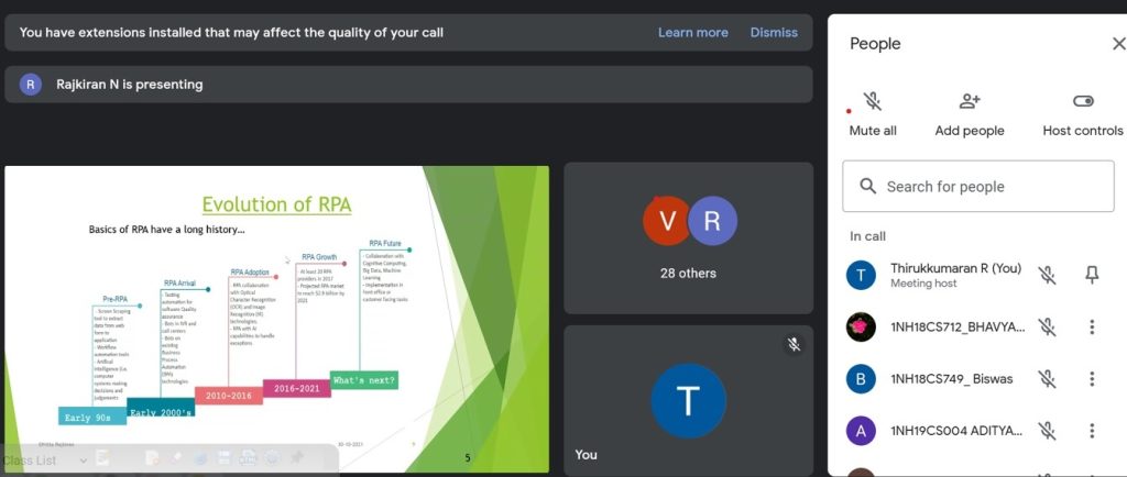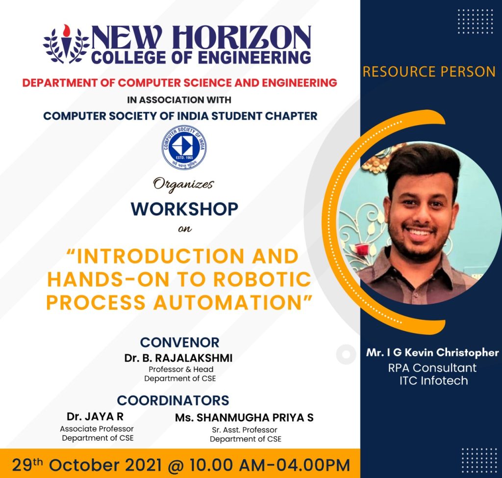 The Department of Computer Science and Engineering conducted a workshop on “Robotic Process Automation – A Case Study ” for the CSE students on 30th October 2021.